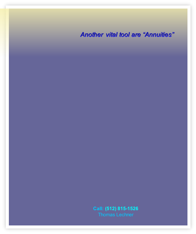 Send me your information, and I will answer back to you the same day.                               Thomas Lechner                  Local Agent for Austin, Texas                               (512) 815-1526 (512) 815-1526  Thomas Lechner I will keep this explanation simple, because not  many people know, what an Annuity really is.  2 types of annuities exist, the “Variable Annuities” which fall under the investment category, and then there are the “money-accumulation contracts”, Medicare Health Plans for Austin Life Insurance for Austin Long Term Care Insurance for Austin Other available great Information Retirement... What do you expect, when it's time to go ? (512) 815-1526 Thomas Lechner